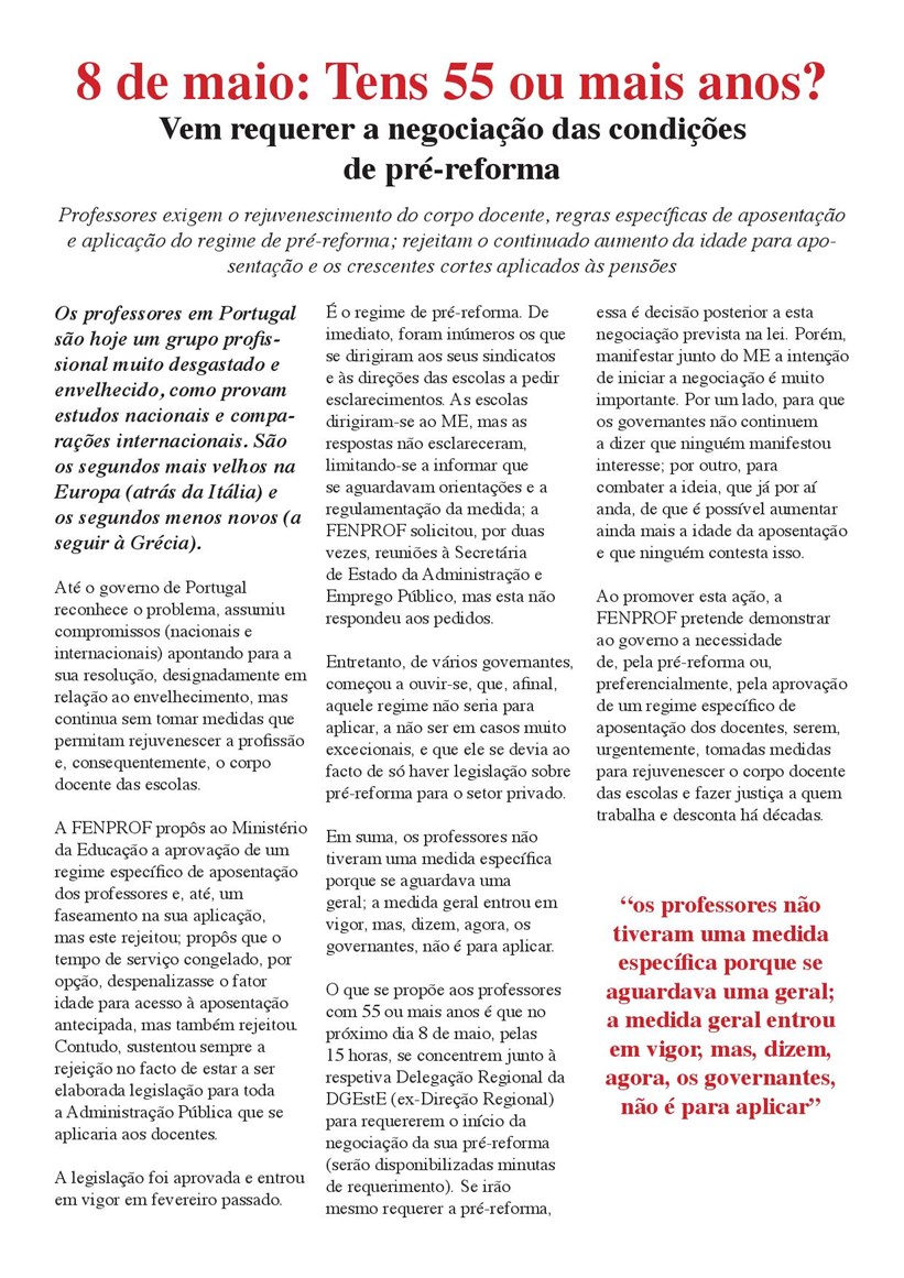 Depois desta ação, na qual para além da exigência do direito à pré-reforma dos docentes, se reafirmou a exigência da criação de um regime específico de aposentação, é hora de continuarmos a agir, entregando às direções das escolas não agrupadas/agrupamentos de escolas um requerimento que vise iniciar o processo e permita a negociação prevista na lei.