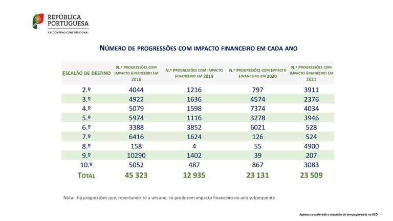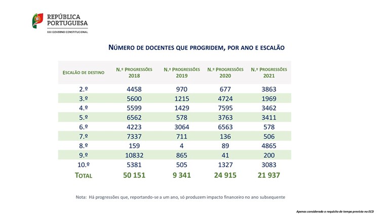 Por exemplo, em reunião anterior, o ME havia informado que seriam 1.162 e 1.035 os docentes que, respetivamente, reuniam condições para progredir aos 5.º e 7.º escalões em 2018. Neste documento, refere-se que há 6.562 em condições de progredir ao 5.º e 7.337 ao 7.º escalão.