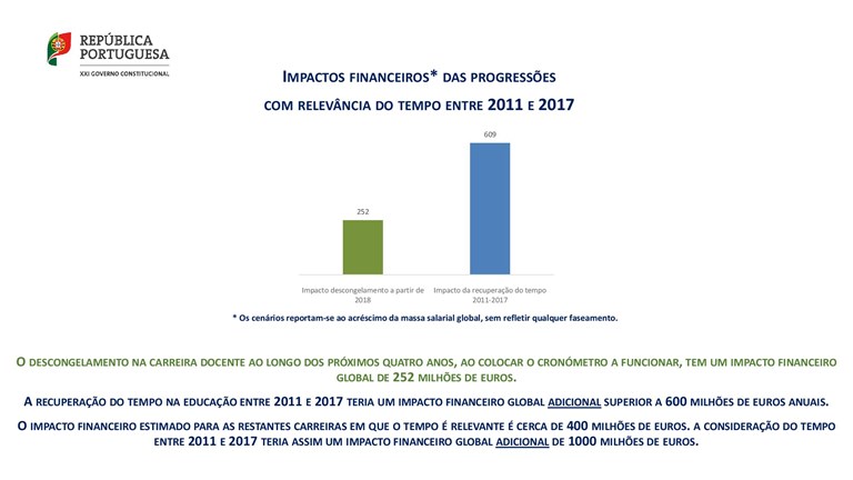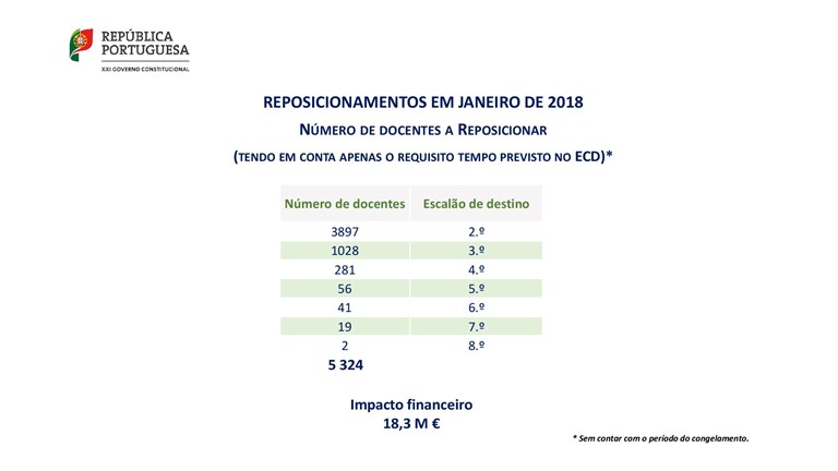 Por último, os 609 Milhões que o ME refere que custaria o reposicionamento de todos os docentes, em 2018, caso se contassem 7 dos mais de 9 anos de congelamento, são também incorretos, pois nunca esteve em cima da mesa tal cenário.