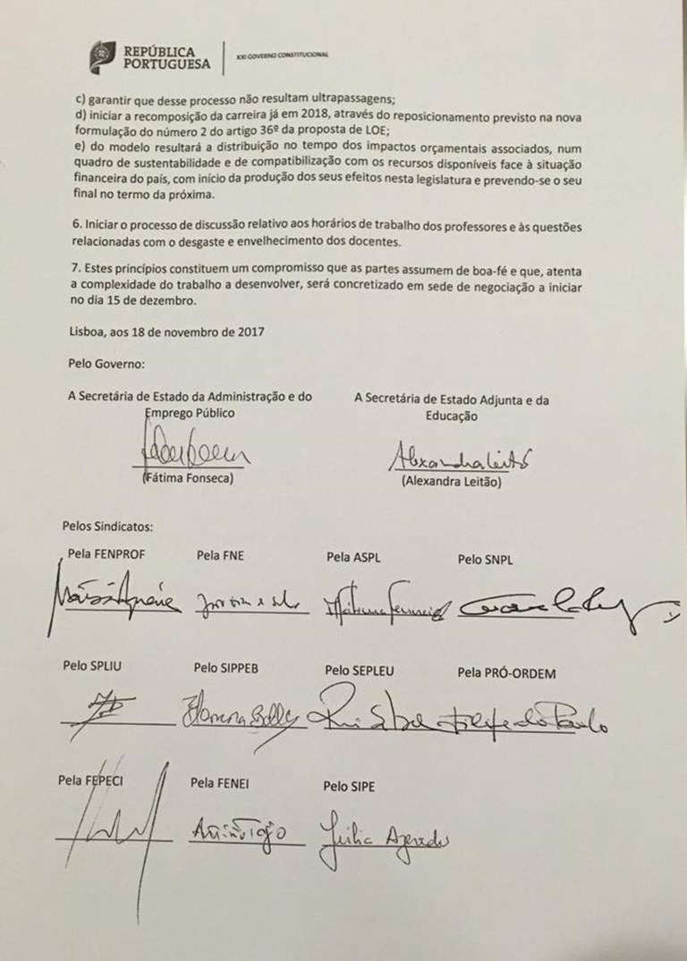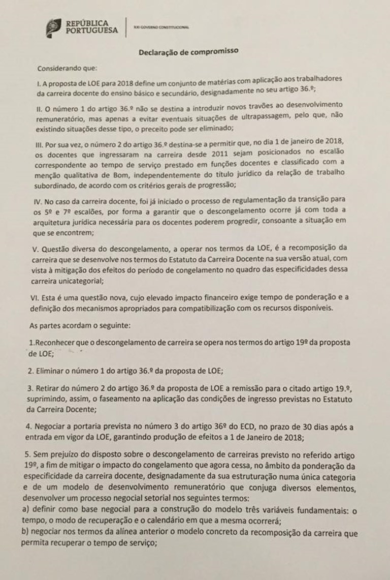 MN: Tais declarações deverão deixar-nos atentos, mas não preocupados. Isto porque, para nós, mais do que o que se diz, vale o que se assina, o que se assume, isto é, os compromissos que são pública e formalmente declarados. E, em relação a esta matéria, o compromisso do governo, assinado pela Dr.ª Fátima Fonseca e pela Dr.ª Alexandra Leitão, na qualidade de representantes do governo, com as organizações sindicais, é muito claro: “V. Questão diversa do congelamento, a operar nos termos da LOE, é a recomposição da carreira que se desenvolve nos termos do Estatuto da Carreira Docente na sua versão atual (…)”.