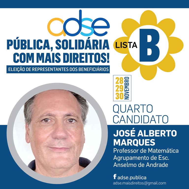 A Lista B, “Por uma ADSE Pública, Solidária” candidata ao Conselho Geral e de Supervisão da ADSE (o conselho dos representantes dos trabalhadores), é aquela que defende, verdadeiramente, os interesses dos beneficiários da ADSE. A Lista B tem um candidato professor, sugerido pelos vários sindicatos que constituem a Fenprof, José Alberto Marques. As eleições realizam-se nos dias 28, 29 e 30 de novembro online, através da página da ADSE DIRETA, ou presencialmente, no dia 30, em locais públicos em todo o país.
