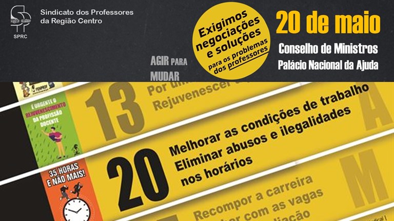 Este bloqueio negocial é, hoje, o principal obstáculo à resolução de problemas e correção de dificuldades na área da Educação e do Ensino. Assim, no dia 20 de maio, a Fenprof voltará a concentrar-se nas imediações do Palácio Nacional da Ajuda, desta vez sob a responsabilidade de organização do SPRC (Sindicato dos Professores da Região Centro).