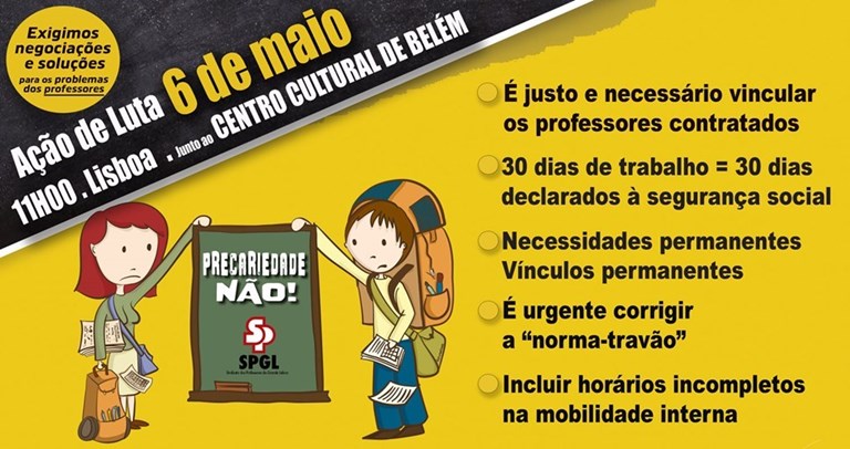 A primeira ação, dia 6 de maio (11 horas), será no Centro Cultural de Belém e o enfoque será a ausência de medidas de combate efetivo à precariedade e, num quadro mais geral, a recusa do Ministério da Educação (ME) em alterar os aspetos mais gravosos do regime de concursos, que estão na origem das inúmeras injustiças sentidas por educadores e professores quando conhecem as suas colocações. Esta ação será organizada e concretizada pelo Sindicato dos Professores da Grande Lisboa (SPGL), enquadrada no conjunto de iniciativas de protesto e exigência.