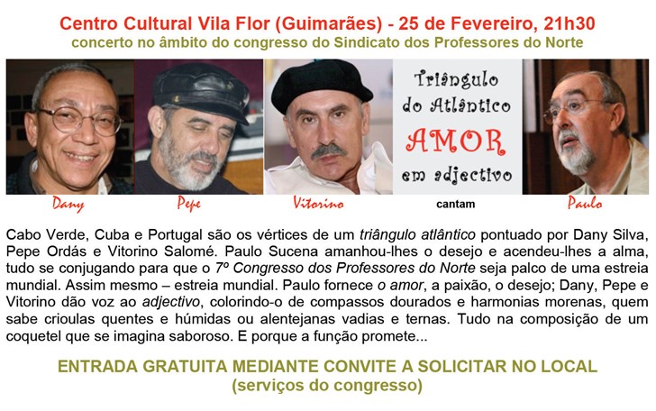 Depois, à noite, a tribuna do Congresso deu lugar ao palco dum espectáculo inesquecível, em que as vozes de Vitorino, Pepe Ordás e Dany Silva, a par da poesia de Paulo Sucena, e da qualidade dos músicos, suscitaram fortes e calorosos aplausos do auditório do Vila Flor. Apresentado por António Baldaia, da Direcção do Sindicato, o espectáculo incluiu na sua primeira parte, em estreia, um conjunto de canções originais com poemas do antigo Secretário Geral da FENPROF do livro "Amor em Adjectivo". / JPO