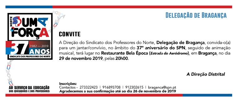 No dia 29 de novembro, a Delegação de Bragança comemorou o 37.º aniversário do Sindicato dos Professores do Norte, com um jantar/convívio, acompanhado de animação musical, proporcionada pelas professoras Isabel Guerra e Carla Subtil e ainda pelo professor Zézé (Zédu Xapéu).