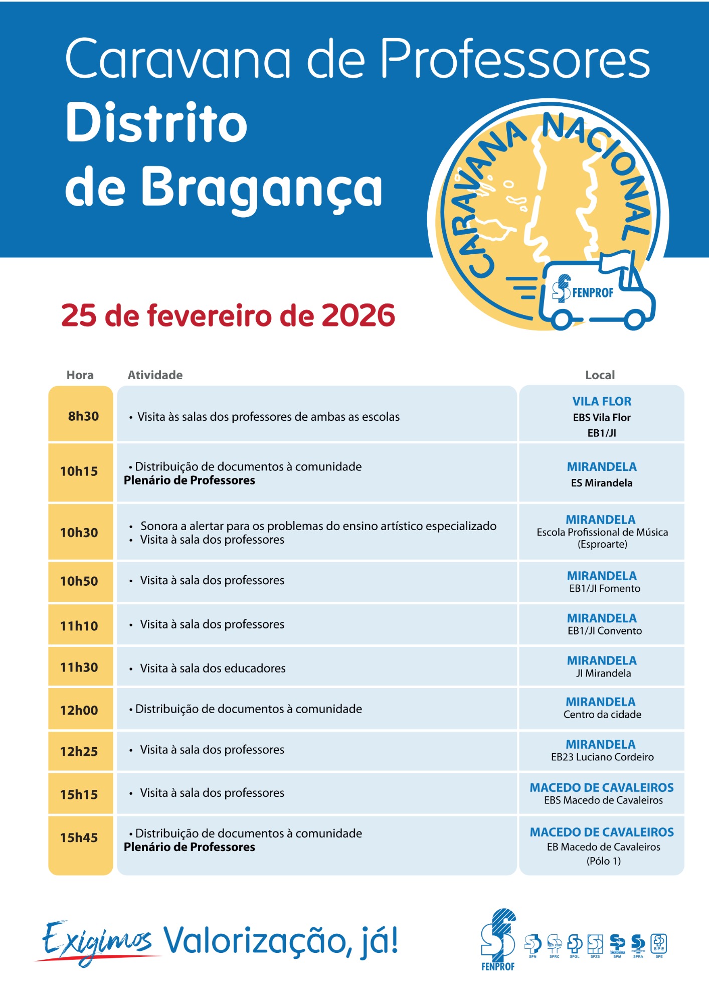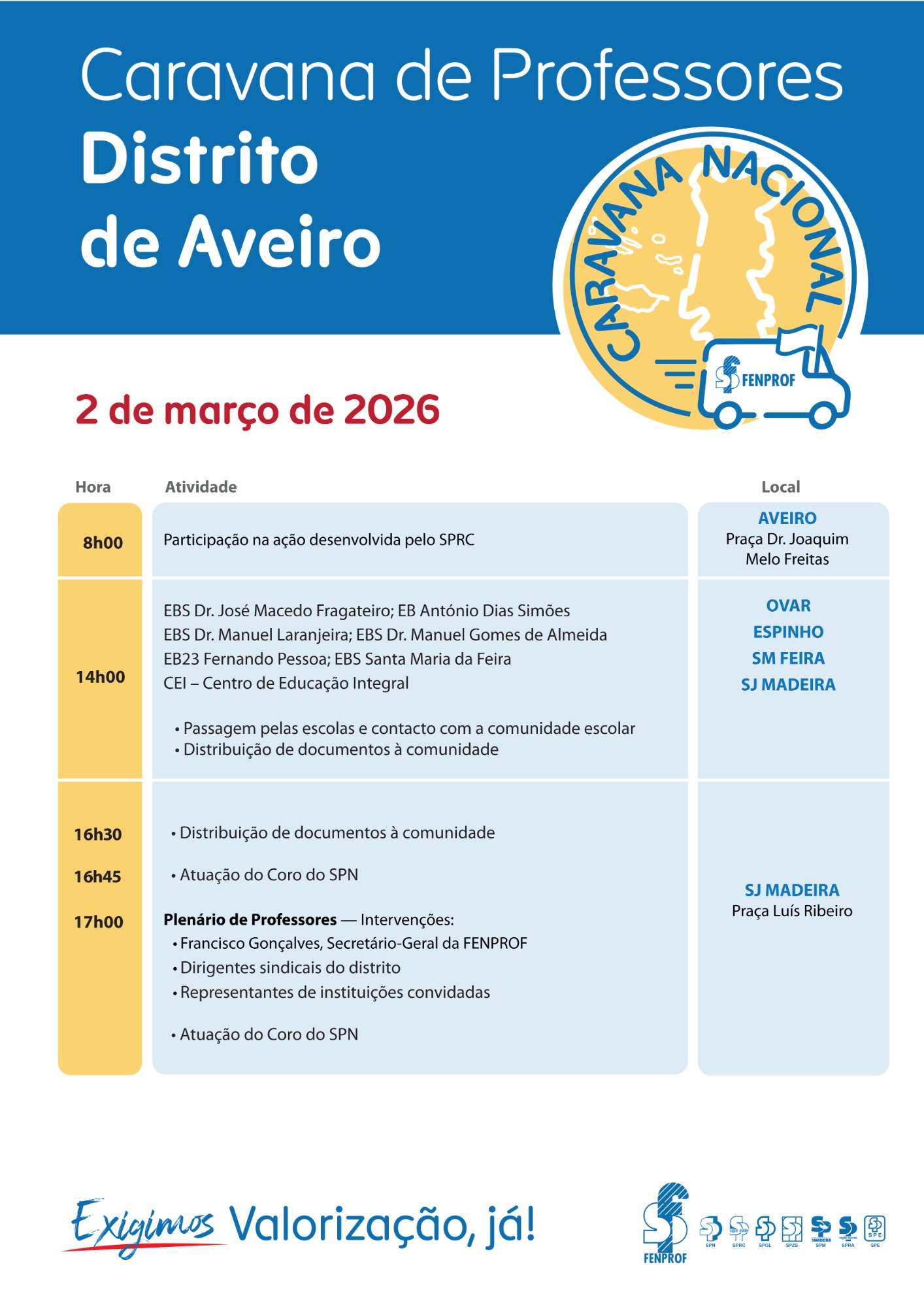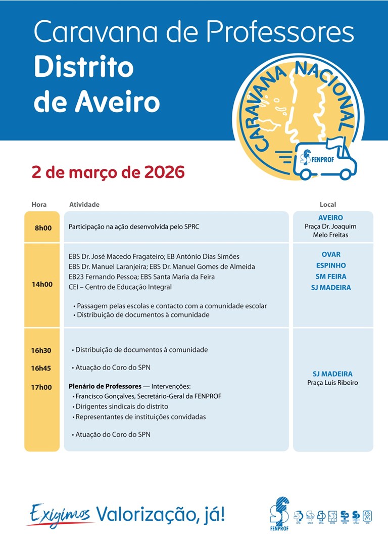 A Fenprof vai promover uma conferência de imprensa para divulgar uma Caravana Nacional — “Somos Professores. Damos rosto ao futuro! Valorização, já!” — que percorrerá o país (regiões autónomas incluídas) entre 19/fev e 4/mar e disso dará conta em conferência de imprensa.