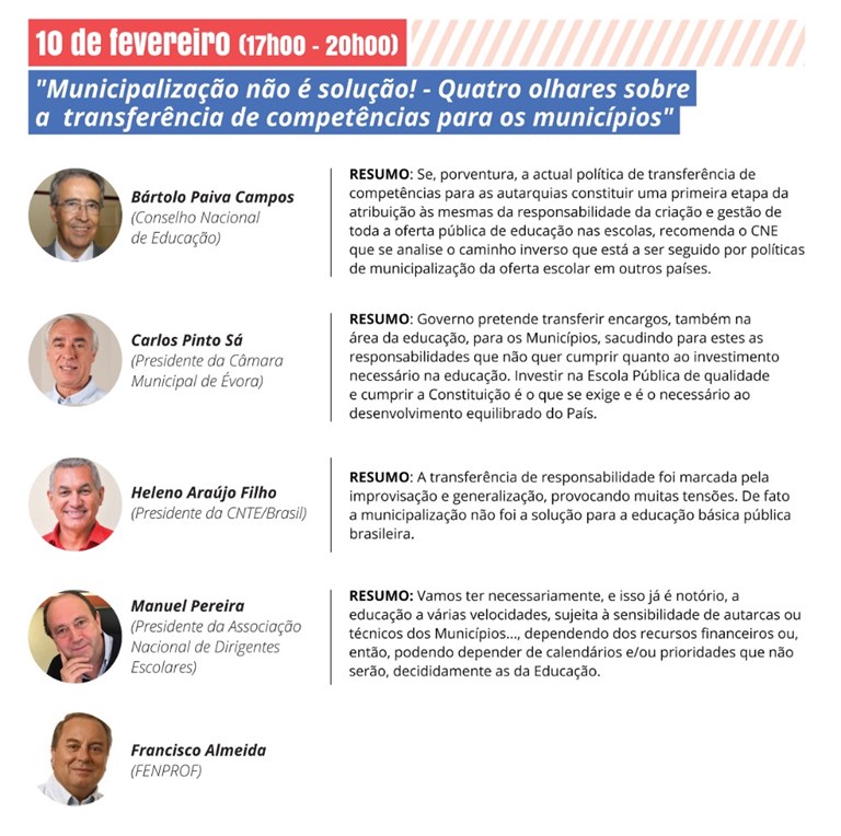 A Fenprof realizou, no passado dia 10 de Fevereiro, um debate em videoconferência sob o lema "municipalização não é solução! – quatro olhares sobre a transferência de competências para os municípios”. Participaram nesta iniciativa Bártolo Paiva Campos, membro do Conselho Nacional da Educação, Carlos Pinto de Sá, Presidente da Câmara Municipal de Évora e membro do Conselho Geral da Associação de Municípios Portugueses, Manuel Pereira, Presidente da Associação Nacional dos Dirigentes Escolares e Heleno Araújo, Presidente da Confederação Nacional dos Trabalhadores em Educação, do Brasil.
