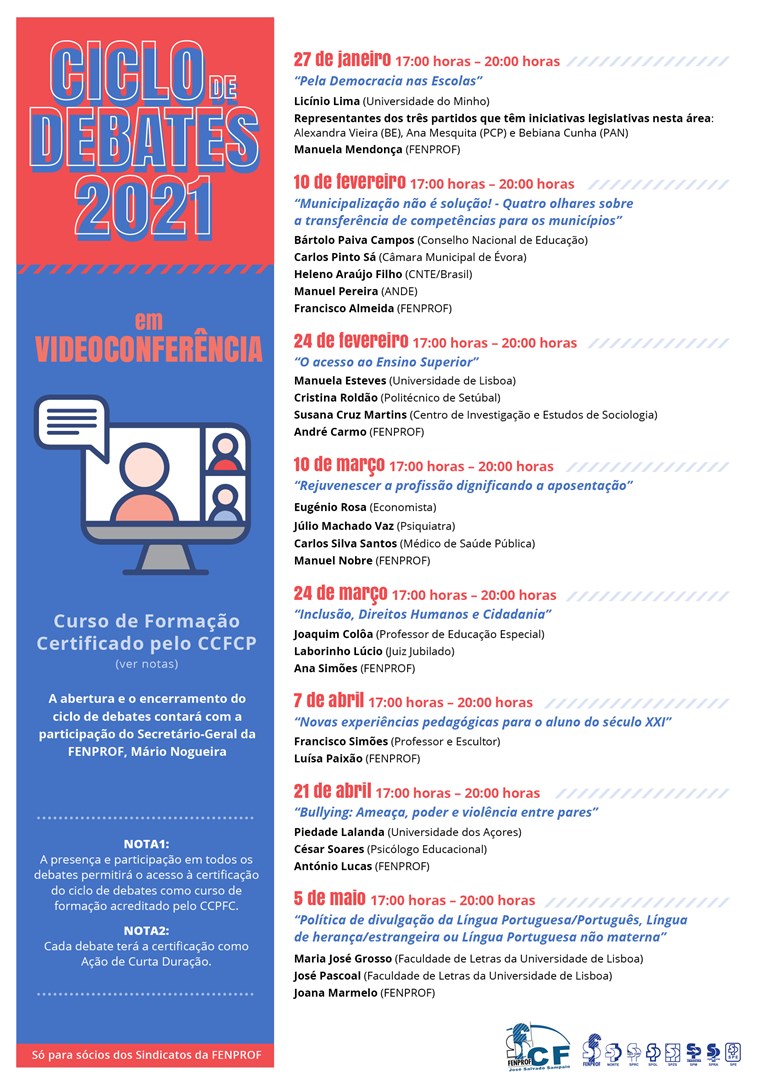 Promovido pelo Centro de Formação José Salvado Sampaio (Fenprof), tem início amanhã (27/jan), o “Ciclo de Debates/2021”, constituído por 8 debates sobre temas diversos, de grande importância e atualidade para a Educação, que contam com a participação de alguns dos principais especialistas nas áreas abordadas.