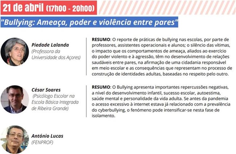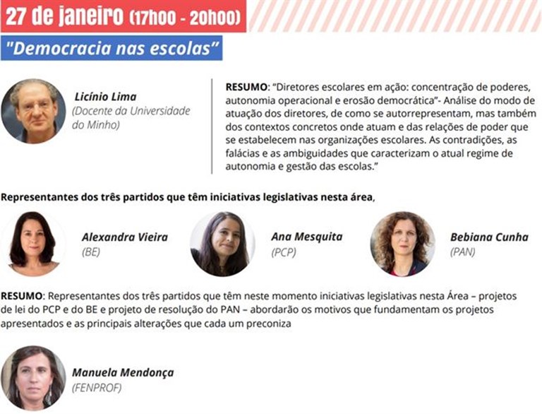 O primeiro debate terá como tema “Democracia nas escolas”, contando com a participação do Professor Licínio Lima, docente da Universidade do Minho, e representantes dos três partidos com iniciativas parlamentares neste domínio – Alexandra Vieira (BE), Ana Mesquita (PCP) e Bebiana Cunha (PAN).O debate será moderado por Manuela Mendonça, Presidente do Conselho Nacional da Fenprof. Antes de se iniciarem os trabalhos, o Secretário-Geral da Federação fará a abertura.