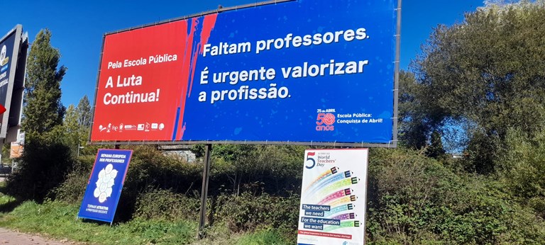 Na Semana Europeia dos Professores, a luta continua, agora com uma mensagem dirigida aos portugueses (4/out), que têm demonstrado compreensão para com as reivindicações dos educadores e dos professores e apoiado à sua luta. Desta vez, numa iniciativa que será apresentada em Viseu, a mensagem passará nas principais vias de circulação automóvel, com a colocação de outdoors.