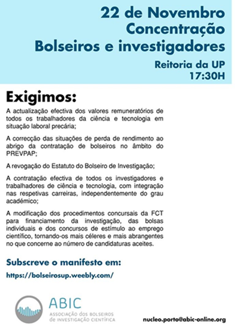 Nesta medida, o SPN apoia mais esta iniciativa da ABIC e apela à participação na Concentração de Bolseiros e Investigadores que vai ter lugar às 17h30 desta sexta-feira, 22 de novembro, frente à Reitoria da Universidade do Porto.