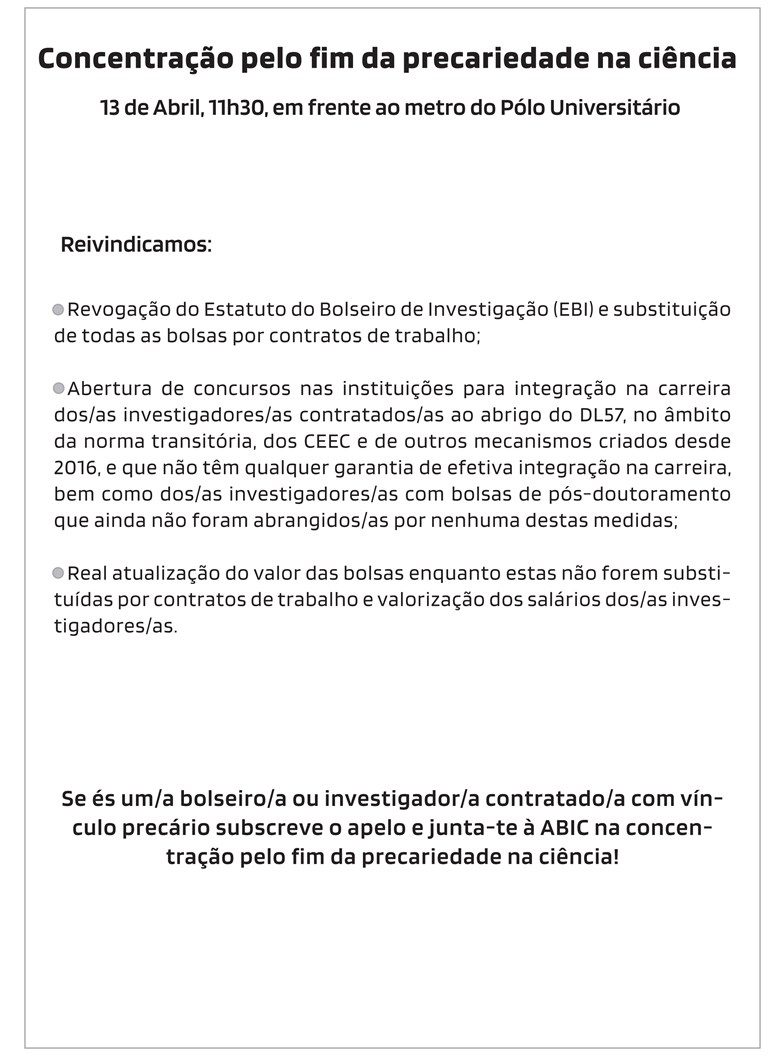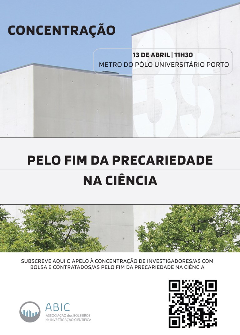 A Associação dos Bolseiros de Investigação Científica (ABIC) convocou para 13 de abril, às 11h30, uma concentração pelo fim da precariedade na ciência, junto ao I3s, no Porto (frente à estação de metro Pólo Universitário).
