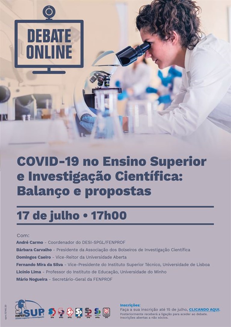 A Fenprof realizou no dia 17 de julho um debate online com André Carmo (Coordenador do DESI-SPGL/Fenprof), Bárbara Carvalho (Presidente da Associação dos Bolseiros de Investigação Científica), Domingos Caeiro (Vice-Reitor da Universidade Aberta), Fernando Mira da Silva (Vice-Presidente do Instituto Superior Técnico, Universidade de Lisboa), Licínio Lima (Professor do Instituto de Educação, Universidade do Minho) e Mário Nogueira (Secretário-geral da Fenprof).