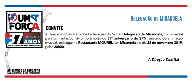 Comemorar o 37º aniversário do Sindicato dos Professores do Norte, em Mirandela, foi um ótimo momento para afirmar o seu projeto sindical. Recordamos a importância da intensa atividade que temos vindo a desenvolver pela valorização da carreira docente e pela melhoria da educação no seu conjunto – da educação pré-escolar ao ensino superior, do setor público ao setor privado.