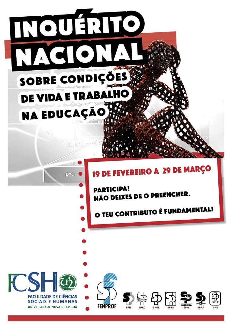 "Aos professores: faço aqui um apelo em nome de toda a equipa que coordeno do estudo das condições de trabalho e vida dos professores, realizado em parceria entre a FCSH e a Fenprof que respondam ao inquérito que chegou às escolas esta semana e pretende ser respondido por 40 mil professores naquele que será um dos maiores estudos de trabalho docente realizado até hoje, mesmo a nível internacional. Por isso apelo para que respondam, sendo que o anonimato dos resultados públicos está completamente assegurado. Sejam ou não sindicalizados, de qualquer área ou ano/turmas etc, público ou privado. Obrigada."