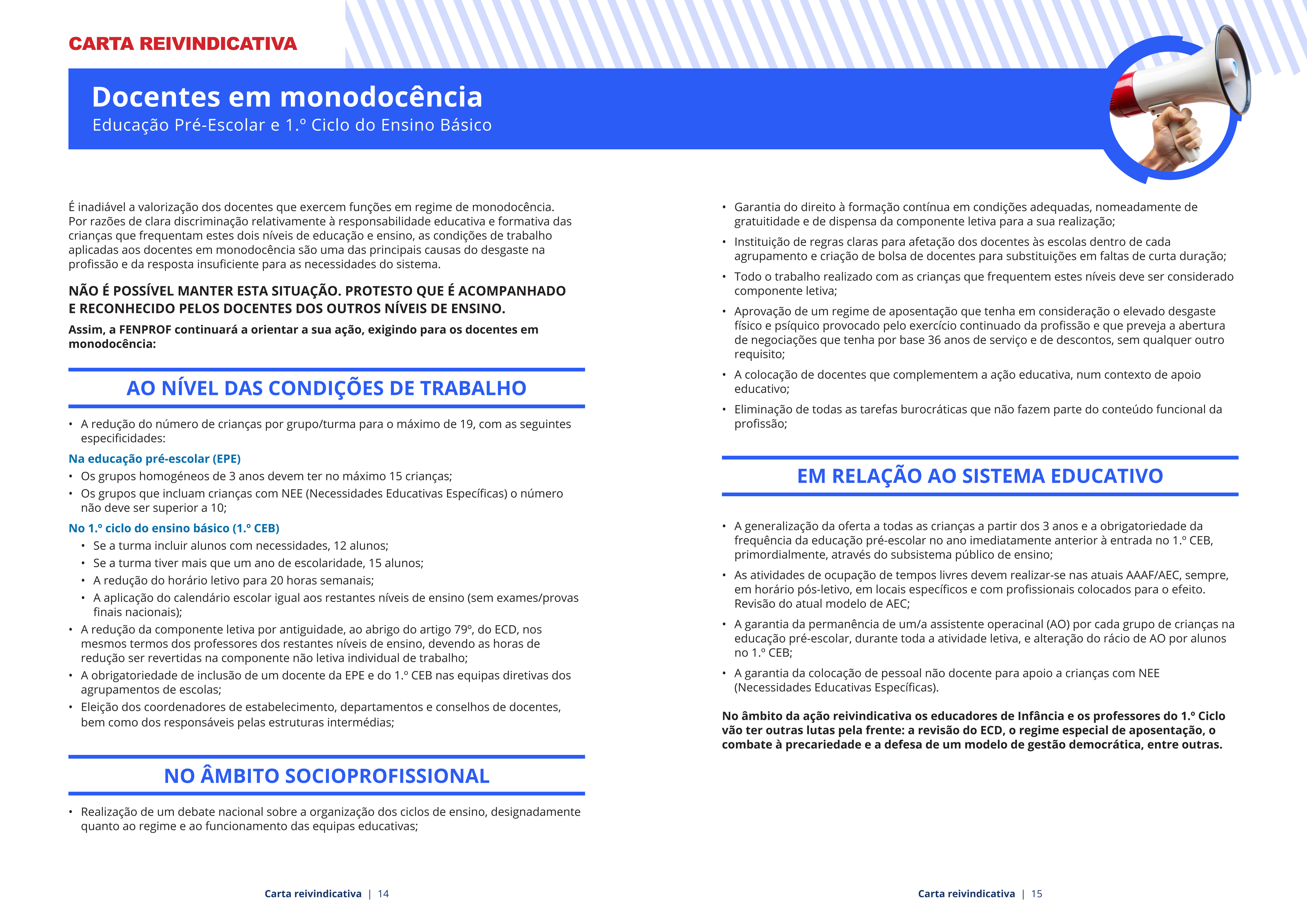 A Fenprof considera imprescindível que o MECI reconheça as especificidades da monodocência e que, no momento em que decorre a discussão e negociação do Estatuto da Carreira Docente (ECD), avance com soluções concretas que valorizem o trabalho desenvolvido nestes grupos de docência e assegurem a equidade com os outros setores, nomeadamente no que respeita à carga letiva e ao calendário escolar, à organização do tempo de trabalho, à redução da carga burocrática, ao desempenho de cargos, à aplicação do art.º 79.º do ECD e ao devido reconhecimento profissional. O plenário terá, igualmente, o objetivo de discutir as condições de trabalho dos docentes da monodocência e reforçar a exigência de respostas efetivas por parte do MECI. O abaixo-assinado entregue, que já deu entrada na Assembleia da República na forma de petição, encontra-se em apreciação na Comissão de Educação e Ciência, devendo posteriormente subir a Plenário.