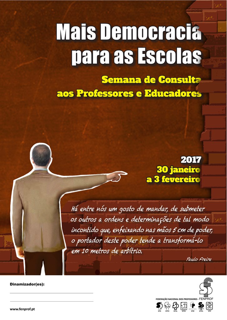 A concretização deste objectivo passa, em primeiro lugar, pela criação em todas as escolas de um forte movimento em torno desta questão. É nesse sentido que se vai realizar uma Semana de Consulta aos professores, desde o dia 30 de Janeiro até ao dia 3 de Fevereiro, através de um pequeno inquérito destinado a auscultar a sua opinião sobre os principais aspectos do actual regime de gestão.