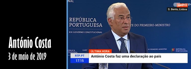 - Excerto da declaração do primeiro-ministro, António Costa, proferida em 3 de maio de 2019.
