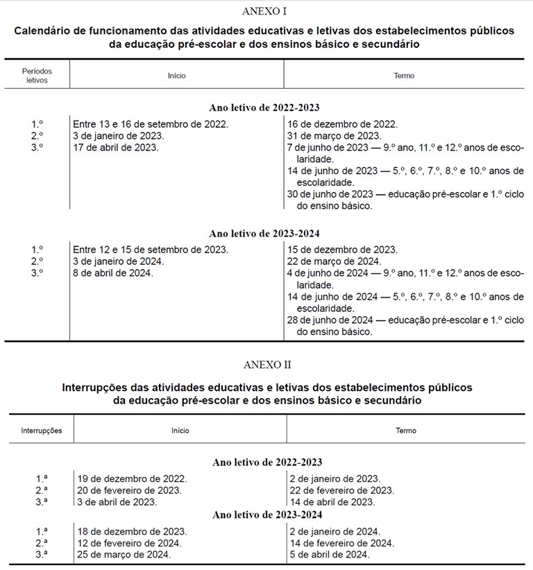 Foi publicado o Despacho n.º 8356/2022, de 8 de julho que aprova o calendário escolar, para os anos letivos de 2022 -2023 e de 2023 -2024, dos estabelecimentos públicos de educação pré -escolar e dos ensinos básico e secundário, dos estabelecimentos particulares de ensino especial, bem como o calendário de provas e exames.