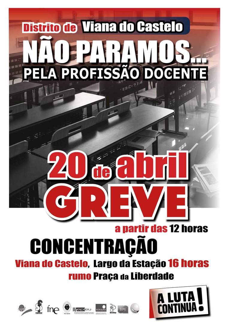 20 de abril foi dia de greve no distrito de Viana do Castelo, onde os educadores e professores mantiveram os níveis de adesão ao protesto registados nos últimos dias. Às 12 horas, na EB23 Frei Bartolomeu dos Mártires, dezenas de docentes assinalaram o início da greve. Às 15 horas, concentraram-se no Largo da Estação e rumaram à Praça da Liberdade.