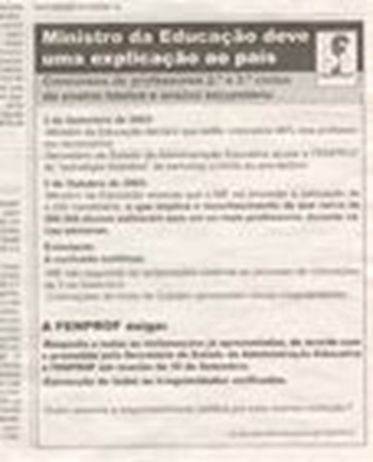 Temos agora, em formato PDF, a lista de colocados: Colocados em Horários Supervenientes (03/10/2003). Cada uma das escolas terá, também, que contactar cada um dos candidatos colocados. Temos, ainda, a indicação de que os candidatos poderão também saber a sua colocação através do SMS. Porque a FENPROF continua a acompanhar todo este processo, deixamos aqui o texto do anúncio que hoje fizemos sair na Comunicação Social: Ministro da Educação deve uma explicação ao país Concursos de professores 3 de Setembro de 2003: - Ministro da Educação declara que estão colocados 99% dos professores necessários; 3 de Outubro de 2003: - Ministro da Educação anuncia que o ME vai proceder à colocação de 4.000 candidatos, o que implica o reconhecimento de que cerca de 300.000 alunos estiveram sem um ou mais professores durante várias semanas. Entretanto - ME não responde às reclamações relativas ao processo de colocações de 3 de Setembro;