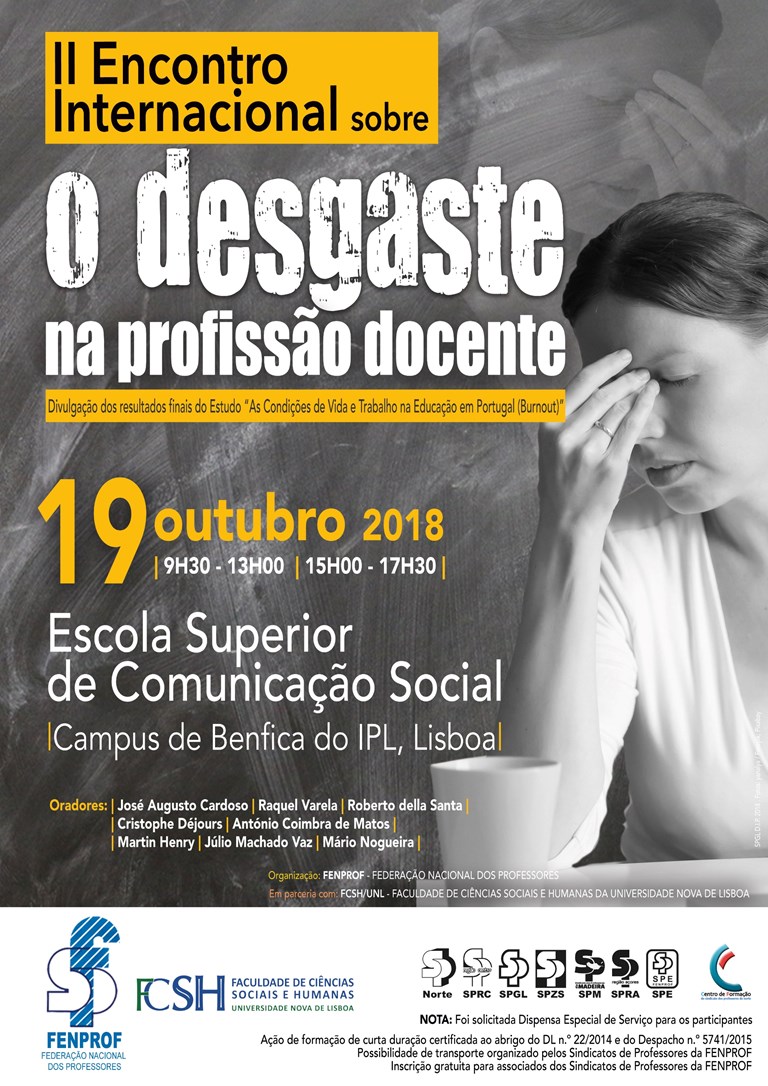 Com a presença de convidados de reconhecido mérito, nacionais e internacionais, realizou-se o II Encontro Internacional Sobre o Desgaste na Profissão Docente que contou coma presença de mais de 200 educadores e professores. No essencial, esteve a apresentação dos resultados finais do maior estudo realizado em Portugal sobre a temática, realizado pela Fenprof em parceria com a Faculdade de Ciências Sociais e Humanas da Universidade Nova e uma equipa de investigadores coordenada por Raquel Varela.