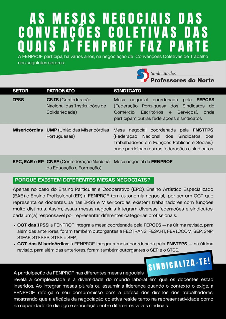 O Sindicato dos Professores do Norte (SPN) preparou um conjunto de cartazes informativos para esclarecer os educadores e professores das Instituições Particulares de Solidariedade Social (IPSS) sobre temas centrais da sua carreira profissional e que abordam questões fundamentais como o congelamento do tempo de serviço, a complexidade das mesas negociais e o impacto real da sindicalização nos salários e direitos dos trabalhadores. Através de exemplos concretos, os cartazes mostram como a ação sindical pode fazer a diferença no quotidiano profissional e reforçam a importância de estar representado por um sindicato que defenda verdadeiramente os interesses da classe docente.