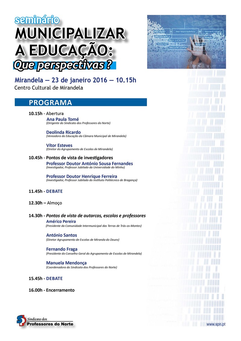 Descentralizar a educação sim. Municipalizar, nem pensar. É esta a posição do Sindicato dos Professores do Norte sobre a aplicação de um decreto-lei, aprovado pelo Governo anterior, que prevê a transferência para os municípios de diversas competências na área da educação e para o qual assinou contratos-piloto com algumas autarquias.