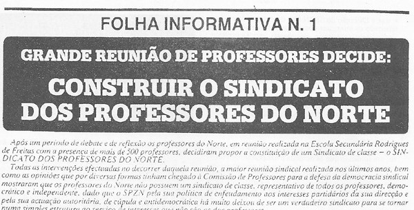 "Todas as intervenções efectuadas no decorrer daquela reunião, a maior reunião sindical realizada nos últimos anos, bem como as opiniões que por diversas formas tinham chegado à Comissão de Professores para a defesa da democracia sindical mostraram que os professores do Norte não possuem um sindicato de classe, representativo de todos os professores, democrático e independente, dado que o SPZN, pela sua política de enfeudamento aos interesses partidários da sua direcção e pela sua actuação autoritária, de cúpula e antidemocrática, há muito deixou de ser um verdadeiro sindicato" (in Folha Informativa n.º 1, sobre a reunião de Professores de 15 de Outubro de 1982, que havia decidido criar o SPN)