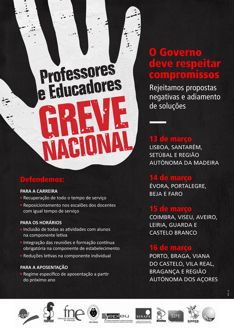 - Greve Nacional de Professores e Educadores a cumprir por regiões, na semana que se inicia a 12 de março, sendo respeitada a seguinte ordem: 12. Norte, 13. Centro, 14. Sul, 15. Regiões Autónomas; 16. Grande Lisboa;