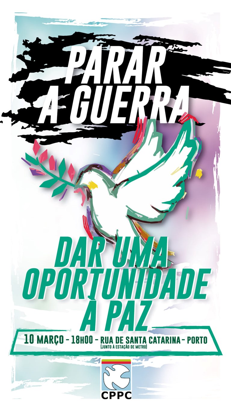 Ato público «Parar a Guerra! Dar uma oportunidade à Paz!»Dia 10 de março | 18 horasRua de Santa Catarina (junto à estação do Metro) | Porto |