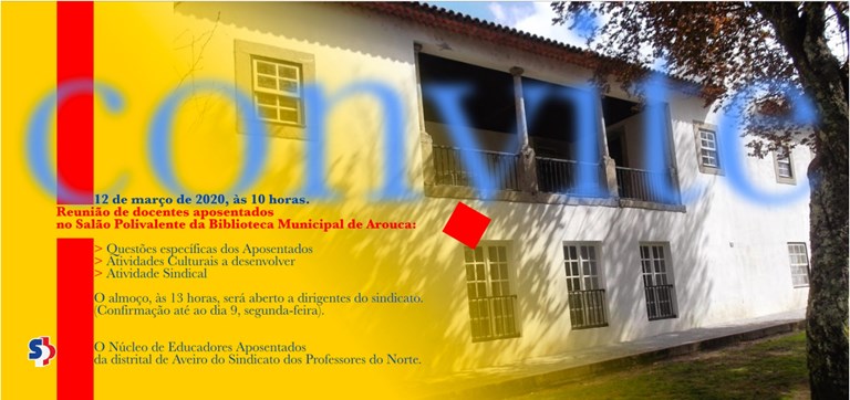 Questões específicas da aposentação, definição de iniciativas a desenvolver e ação sindical são algumas das temáticas que os docentes aposentados abordarão, no dia 12 de março, pelas 10 horas, na Biblioteca Municipal de Arouca, numa iniciativa do Núcleo de Educadores Aposentados da Distrital de Aveiro do SPN.