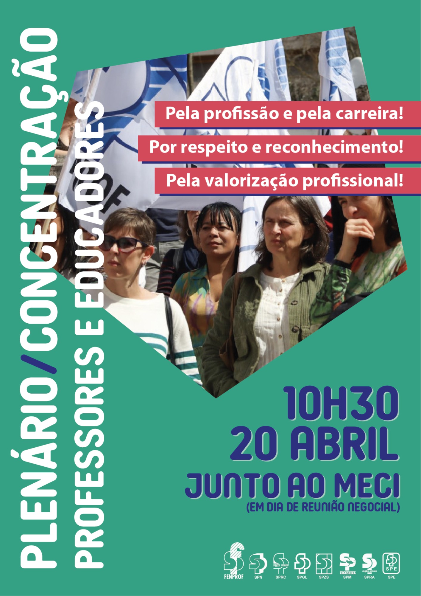 A Fenprof reúne com o Ministério da Educação, Ciência e Inovação (MECI), no dia 20 de abril, pelas 11h horas, no âmbito do processo de revisão do Estatuto da Carreira Docente (ECD). E, enquanto durar a reunião, promove um plenário/concentração de docentes junto às instalações do MECI, com o objetivo afirmar a exigência da valorização da profissão e da carreira.