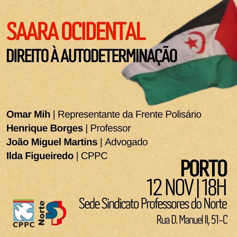 Em 12/nov, na Sede do Sindicato dos Professores do Norte (SPN), no Porto, às 18 horas, terá lugar uma sessão pública de solidariedade com Saara Ocidental, com a participação de Omar Mih (Frente Polisário), Henrique Borges (SPN), João Miguel Martins (advogado) e Ilda Figueiredo (CPPC).