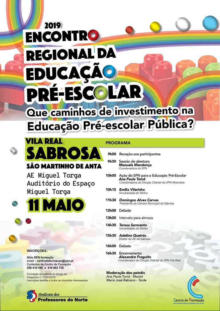 No dia 11 de maio, em S. Martinho de Anta (Sabrosa), a Delegação de Vila Real do Sindicato dos Professores do Norte organizou o Encontro da Educação Pré-escolar, com o lema «Que caminhos de investimento na Educação Pré-escolar publica?», onde se discutiram as políticas educativas para a infância. Os painéis foram constituídos por diferentes oradores envolvidos na 1.ª etapa de educação, académicos, políticos, gestores das escolas, dirigentes sindicais e educadoras de infância. Promover o Investimento na expansão da Educação Pré-escolar pública é um dos objetivos do plano de ação do SPN apresentado e analisado.