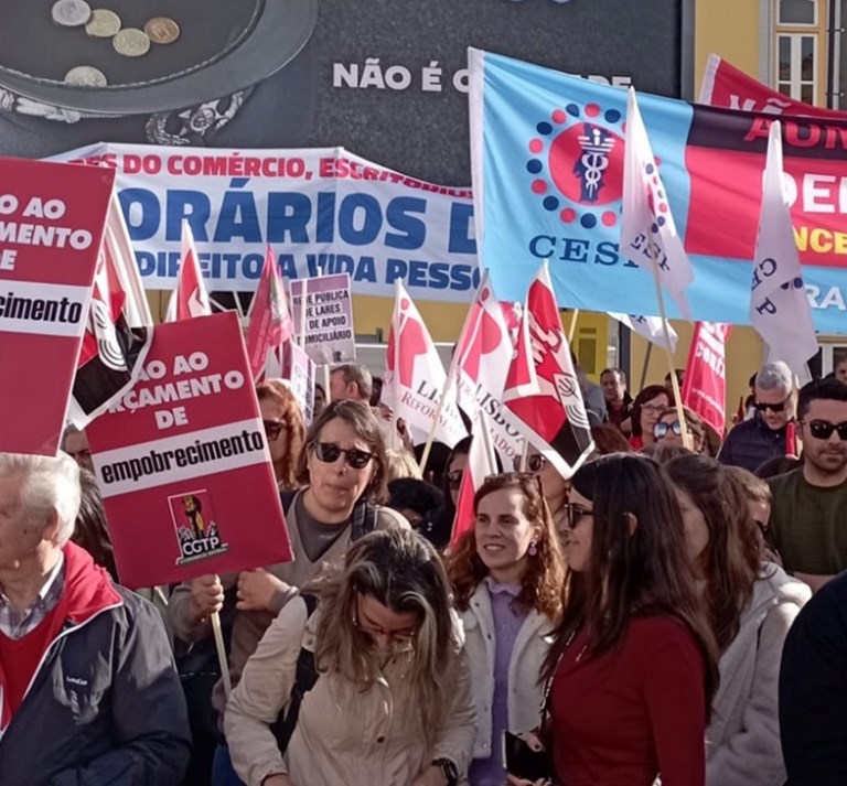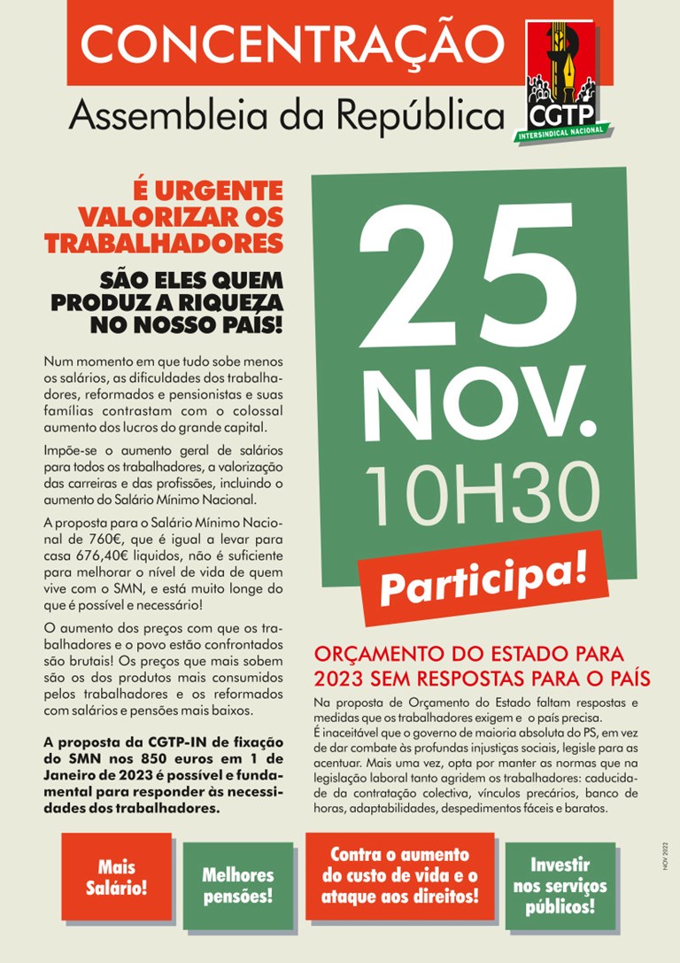Mais uma jornada de luta contra o Orçamento de Estado para 2023 que não responde aos problemas do pais e dos trabalhadores. Só é vencido quem desiste de lutar. A luta continua nas empresas, nas escolas e na rua. Nesta ação de luta, a CGTP-IN alertou para a necessidade de respostas aos problemas dos trabalhadores e do país, e a importância da luta pelo aumento dos salários e pensões como forma de repor e melhorar o poder de compra. No final da iniciativa foi aprovada a resolução: “Mais salário! Melhores pensões! | Contra o aumento do custo de vida e o ataque aos direitos | Investir nos serviços públicos”.