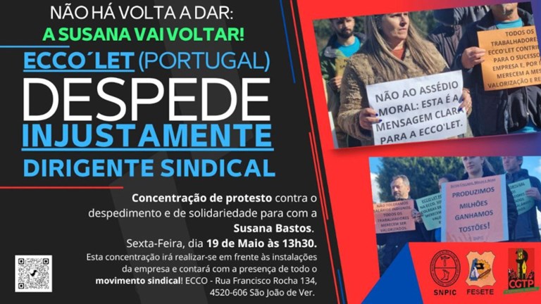 Dia 19 de maio (sexta-feira), a Federação dos Sindicatos dos Trabalhadores Têxteis, Lanifícios, Vestuário, Calçado e Peles de Portugal (Fesete) e o Sindicato Nacional do Calçado, Malas e Afins (Fnpic) promoveram uma concentração de protesto e solidariedade contra o despedimento injusto de 45 trabalhadoras, entre elas, Susana Bastos, dirigente sindical. A concentração, com início às 13h30, realizou-se em frente às instalações da empresa Ecco (São João de Ver). O SPN em solidariedade com as trabalhadoras despedidas marcou presença.