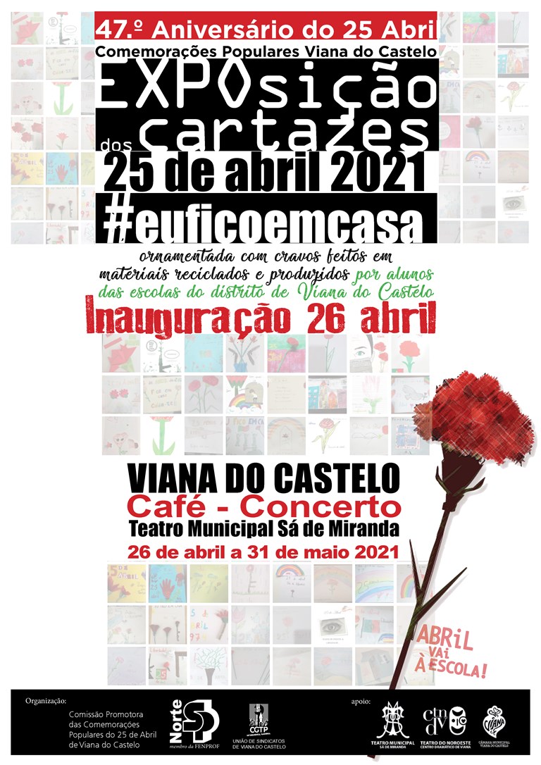 Integrada nas comemorações populares do 25 de Abril de Viana do Castelo/2021, esta exposição engloba duas iniciativas, promovidas pelo SPN/Viana do Castelo. A primeira, realizada em abril/2020 – “#euficoemcasa” –, constou da produção, por parte dos alunos, de cartazes alusivos ao 25 de Abril; a segunda iniciativa, proposta para o presente ano, versou a produção de cravos, em materiais recicláveis. Ambas as iniciativas inserem-se na atividade “O 25 de Abril vai à Escola”, com que, ano após ano, o SPN/Viana do Castelo celebra o Dia da Liberdade. É, pois, o conjunto de cartazes produzidos no ano passado, que por força da pandemia ainda não tinham sido mostrados à cidade, e de cravos feitos pelos alunos, e que abrilhantam o espaço, aquilo que o visitante poderá admirar.