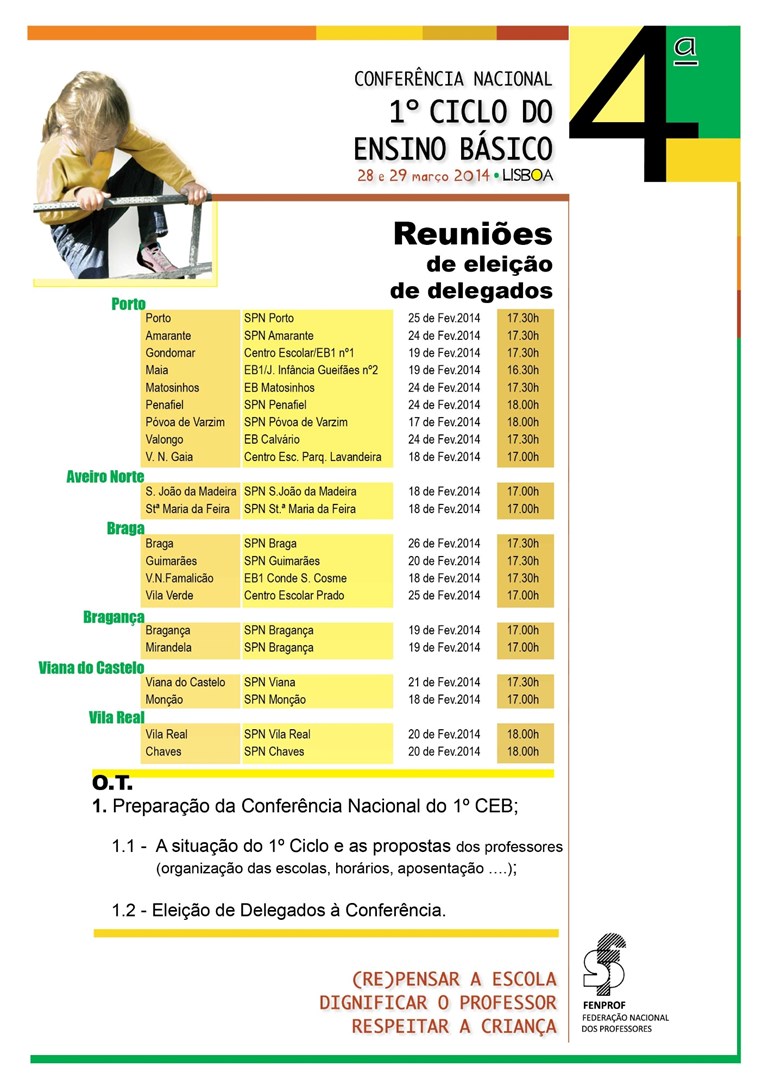 Para que todos os docentes possam participar neste importante momento de debate e de preparação da ação, particularmente dos professores do 1.º ciclo do ensino básico, divulgam-se os locais de reunião, bem como o horário e os delegados a eleger, em cada região.