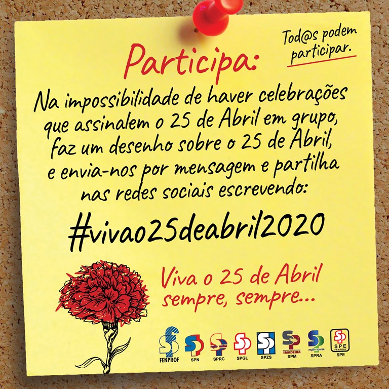 Na impossibilidade de se comemorar o 25 de Abril em grupo, a Fenprof lança um desafio para uma comemoração digna, ainda que estejamos encerrados em casa –convidamo-lo a incentivar os seus alunos a representar o 25 de Abril em desenho, que deverá enviar para os emails dos Sindicatos e partilhar nas redes sociais, escrevendo #vivao25deabril2020.